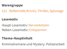 Die Lesemotive sind zwischen "Warengruppe" und "Thema-Hauptinhalt" zu finden. Klicken Sie auf die orangefarbenen Worte bei Lesemotiv, gelangen Sie auf eine neue Suchergebnisliste mit dem jeweils ausgewählten Begriff.