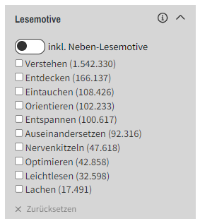 Nutzen Sie den neuen Filter, um nach Titeln mit bestimmten Lesemotiven zu suchen. Standardmäßig ist die Suche nach Haupt-Lesemotiv voreingestellt. Schieben Sie den Schieberegler nach rechts, wird das Lesemotiv sowohl in den Haupt-, wie auch in den Neben-Lesemotiven gesucht. Haben Sie den Schieberegler aktiviert, entspricht die gefundene Trefferanzahl innerhalb des Filters der Trefferanzahl der gefunden Lesemotive in den Haupt- und Neben-Lesemotiven, nicht der gefunden Titelanzahl.