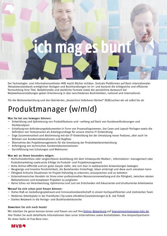 Für die Weiterentwicklung und den Betrieb des VLB "Verzeichnis Lieferbarer Bücher" suchen wir ab sofort Sie als Produktmanager (w/m/d).