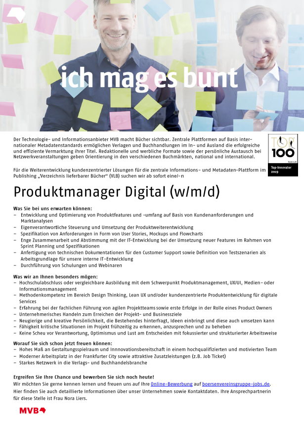 Für die Weiterentwicklung und den Betrieb des VLB "Verzeichnis Lieferbarer Bücher" suchen wir ab sofort Sie als Produktmanager (w/m/d).