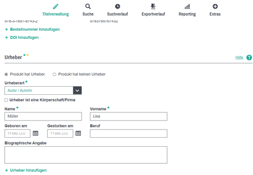 Falls Sie eine gemeinsame biografische Anmerkung für alle Urheber anbieten möchten, können Sie diese als Zusatztext hinterlegen. Falls Sie nur diese und keine Vita an den einzelnen Urhebern hinterlegen, ist eine Anzeige am Urheber auch nicht möglich. Außerdem zeigen viele Webshops aber auch VLB-TIX biografische Anmerkungen aus Zusatztexten nicht an. Entsprechend raten wir von der ausschließlichen Meldung von biographischen Anmerkungen in Zusatztexten ab.