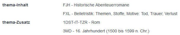 - Mit dem Thema-Inhalt FJH - Historische Abenteuerromane wird aus dem Bereich F - Belletristik nur der speziellste Code auf der niedrigsten Ebene angegeben, d.h.: