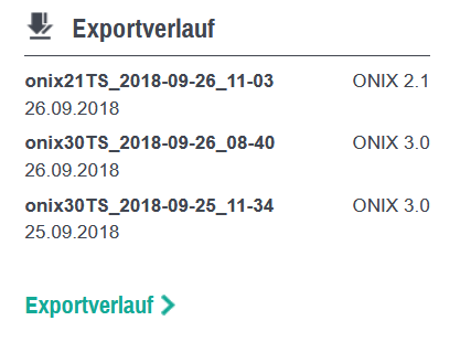 Im Widget Exportverlauf werden Ihnen die drei von Ihnen zuletzt durchgeführten Exporte angezeigt. Durch Klicken auf einen der Exporte starten Sie den Download der Exportdatei erneut. Auch hier können Sie dem Link folgen, um zu einer umfassenden Darstellung des Exportverlaufs zu gelangen.