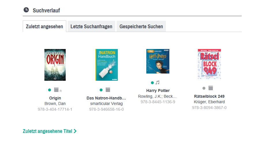 Hierüber gelangen Sie zum Suchverlauf, in dem Sie alle Informationen zu den von Ihnen bislang getätigten Suchen, den von Ihnen zuletzt angesehenen Titeln und eine Übersicht der gespeicherten Suchanfragen finden können.