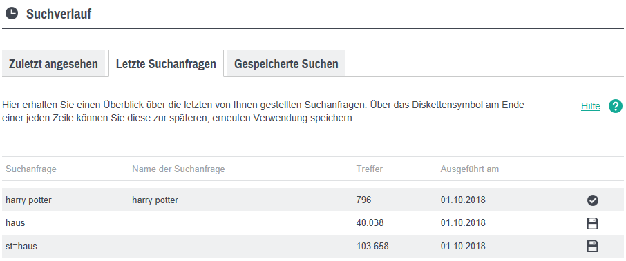 - Jede aufgeführte Suchanfrage kann erneut ausgeführt werden, indem Sie auf die jeweilige Zeile klicken.
