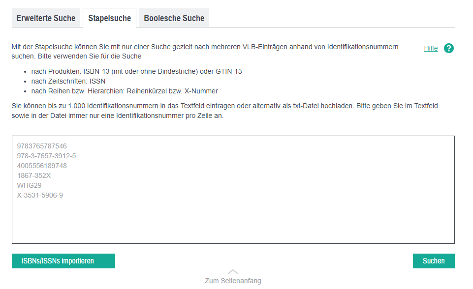 Verwenden Sie für die Suche bitte die ISBN-13 (mit oder ohne Bindestriche), GTIN-13 (bzw. EAN), ISSN (für Zeitschriften), Reihenkürzel oder X-Nummern für Hierarchien.