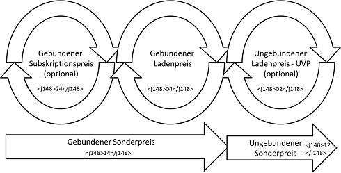 Für Produktpreise mit Ladenpreisbindung muss immer mindestens ein gebundener Ladenpreis angegeben werden. Dem ersten gebundenen Ladenpreis können ein oder mehrere gebundene Subskriptionspreise vorangestellt sein. Dem letzten gebundenen Ladenpreis können ein oder mehrere ungebundene Ladenpreise nachgestellt sein.