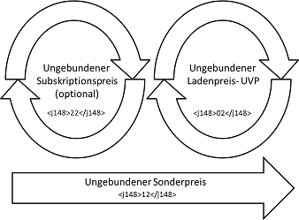 Für Produktpreise ohne Ladenpreisbindung muss immer mindestens ein ungebundener Ladenpreis angegeben werden. Dem ersten ungebundenen Ladenpreis können ein oder mehrere ungebundene Subskriptionspreise vorangestellt sein.