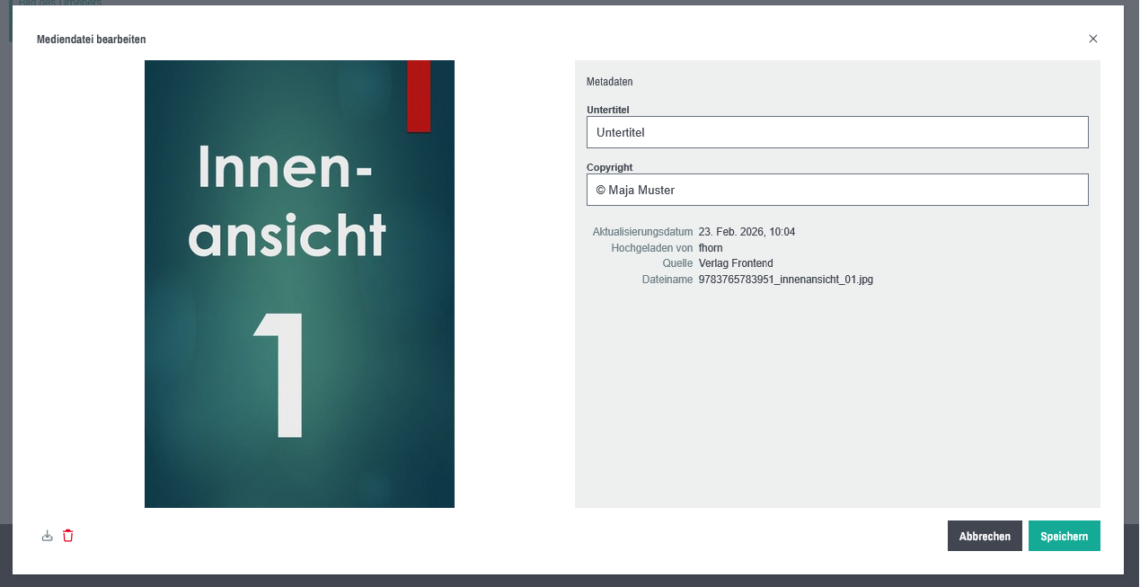 - Um zusätzliche Metadaten wie Untertitel und Copyright beim Cover zu ergänzen, klicken Sie bitte auf das Vorschaubild des Covers