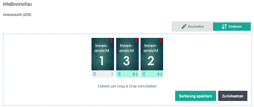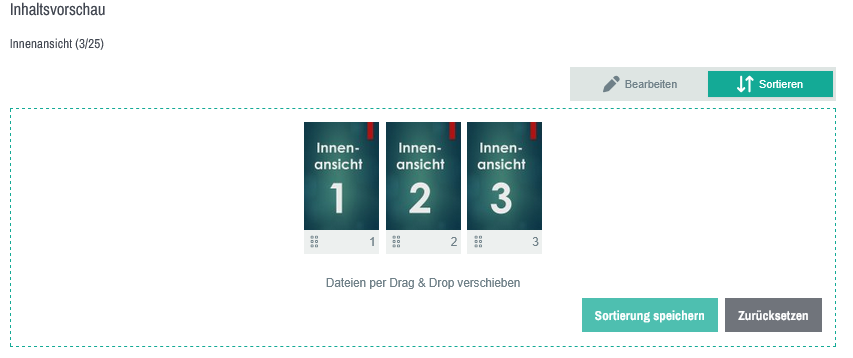 Wenn Sie mehrere Dateien eines Medientyps hochgeladen haben, z. B. 3 Innenansichten und die Reihenfolge nun ändern möchten, können Sie die Dateien wie folgt neu sortieren: