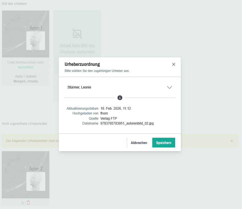 Das VLB empfiehlt, nicht zugeordnete Urheberbilder den entsprechenden Urhebern zuzuordnen, damit die Bilder in den Produktdetails im VLB oder bei VLB-TIX direkt an der Urheberin angezeigt werden
