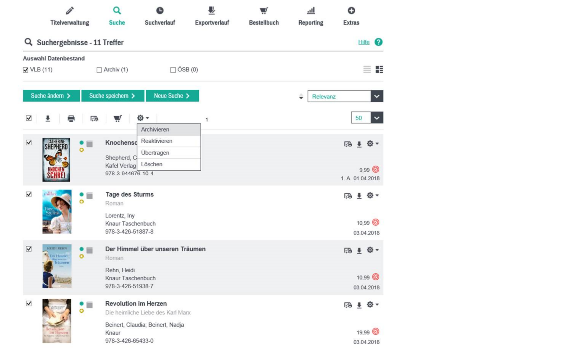 In der Trefferliste können Sie entweder einzelne Titel archivieren, indem Sie die Aktion Archivieren aus dem Zahnradmenü am jeweiligen Titel auswählen oder Sie archivieren direkt mehrere Titel. Hierzu wählen Sie zunächst die Checkboxen der Titel aus, die Sie archivieren möchten. Haben Sie Ihre Auswahl getroffen, so können Sie im zweiten Schritt über das Zahnrad-Menü oberhalb der Trefferliste die Titel archivieren.