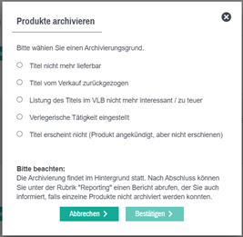 Bitte wählen Sie zunächst aus der Lightbox einen Grund aus, weswegen der oder die Titel archiviert werden sollen. Im Anschluss können Sie die Archivierung dann bestätigen.