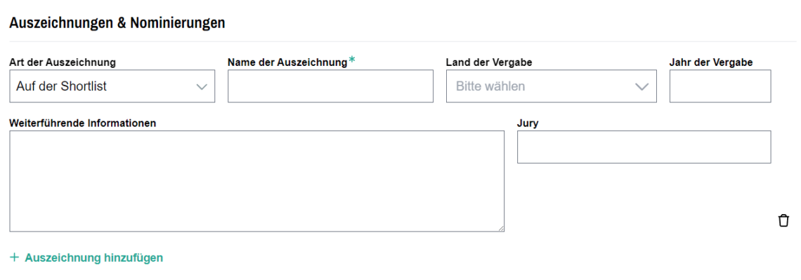 - Jahr der Vergabe: Hier lässt sich das Jahr, in dem die Auszeichnung erfolgte, hinterlegen.