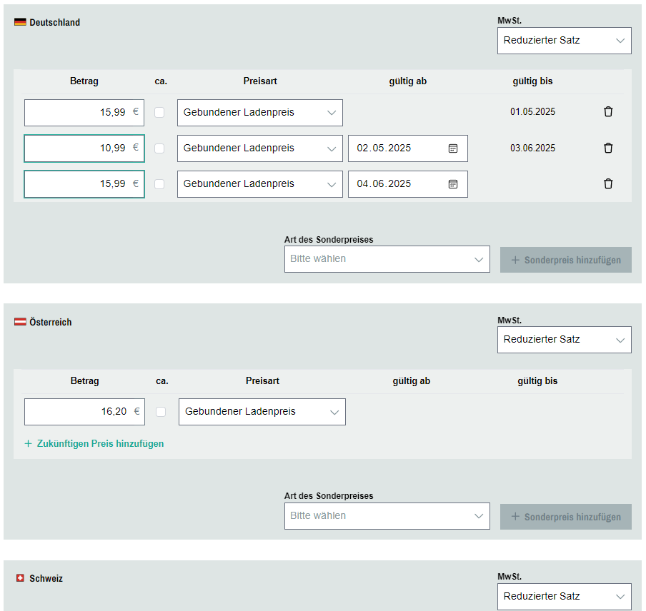Im Bereich Preise geben Sie Laden- und Sonderpreise für Deutschland, Österreich und die Schweiz an. Auch entscheiden Sie hier, ob Ihr Produkt eine Ladenpreisbindung besitzt oder wann eine Ladenpreisaufhebung gültig wird.