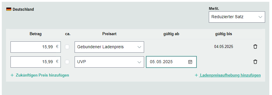 Über das Feld "+ Ladenpreisaufhebung hinzufügen" kann für Deutschland bequem eine Ladenpreisaufhebung festgelegt werden. Dabei wird eine neue Zeile mit einer UVP-Preisart erzeugt. Geben Sie in dieser Zeile das Datum an, ab dem die Preisbindung für Ihr Produkt aufgehoben sein soll. Im Feld "Betrag" können Sie die UVP, die automatisch mit dem letztgültigen Ladenrpeis-Betrag befüllt ist, ändern.