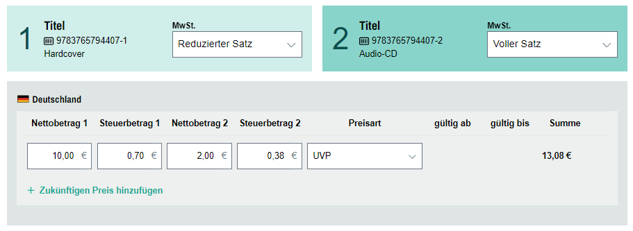 Für Deutschland, Österreich und die Schweiz ist es im VLB verbindlich einen Mehrwertsteuersatz festzulegen. Darüber hinaus können Sie für Produkte mit Mehrwertsteuer-Splitting, Steuer- und Nettoangaben für die enthaltenen Teilprodukte vornehmen.