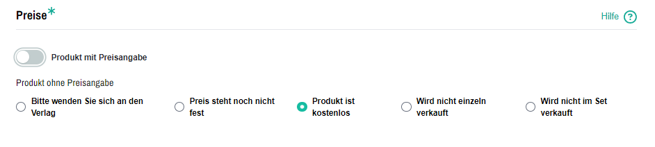 Über die Preisart bestimmen Sie, ob Ihr Produkt der Ladenpreisbindung unterliegt. Falls Ihr Produkt bereits von der Ladenpreisbindung aufgehoben ist oder nie eine Ladenpreisbindung besaß, verwenden Sie bitte ausschließlich die entsprechenden Preisarten.
