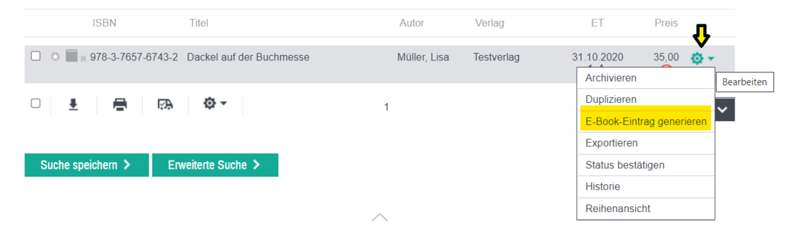 Generieren Sie aus einem bereits bestehenden Titel einen E-Book-Eintrag, wird der Produktverweis zu dem Ausgangstitel automatisch angelegt. Sie können den E-Book-Eintrag über den Titel aus der Trefferliste oder aus der Titeldetailansicht generieren. Weitere Informationen zum E-Book-Eintrag finden Sie in der Funktionsübersicht.