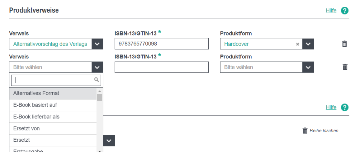 Mit Klick auf das Plus-Symbol öffnen sich die Eingabefelder. Nun wählen Sie zunächst aus dem Dropdown-Menü unter „Verweis“ aus, um welche Art von Verweis es sich handelt (also bspw. ein ergänzendes Produkt oder eine Sonderausgabe). Haben Sie eine Art des Verweises ausgewählt, geben Sie nun die ISBN oder GTIN des Produkts an, auf welches Sie verweisen. Anschließend wählen Sie aus dem untersten Dropdown-Menü noch aus, welcher Produktform das verknüpfte Produkt zuzuordnen ist. Sie können über das Plus-Symbol beliebig viele Produktverweise hinzufügen oder diese mithilfe des Mülleimer-Symbols auch wieder löschen.