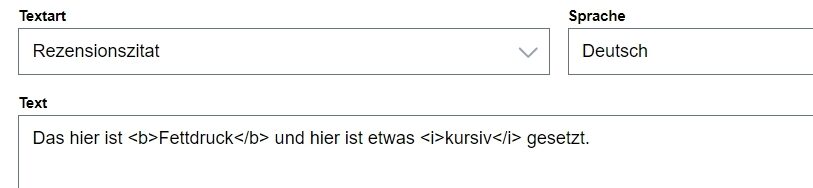 Für die Texte können Sie zur Formatierung auch HTML-Tags nutzen. Für eine Liste der erlaubten Formatierungstags konsultieren Sie unsere ONIX-Empfehlungen für die Zusatztexte. Achten Sie bitte darauf, dass nicht korrekt formatierte HTML-Tags beim Speichern gelöscht werden (nur der Text bleibt erhalten); außerdem müssen Sie, wenn Sie HTML verwenden, auch alle Zeilenumbrüche mit den dafür vorgesehenen HTML-Tags kennzeichnen, einfache Textumbrüche werden in einem HTML-Text nicht erkannt.