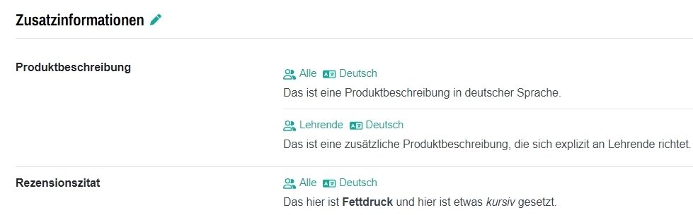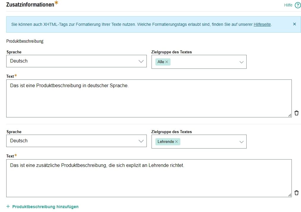 Sie können eine weitere Produktbeschreibung hinzufügen, indem Sie auf das Plus-Symbol „Produktbeschreibung hinzufügen“ klicken. Wenn Sie bspw. ein Produktbeschreibung für Bibliotheken ergänzen möchten, wählen Sie im Dropdown die entsprechende Zielgruppe im Dropdown aus und ergänzen den Text im Freitextfeld. Über das Mülleimer-Symbol können Sie die hinzugefügten Einträge jederzeit wieder löschen.