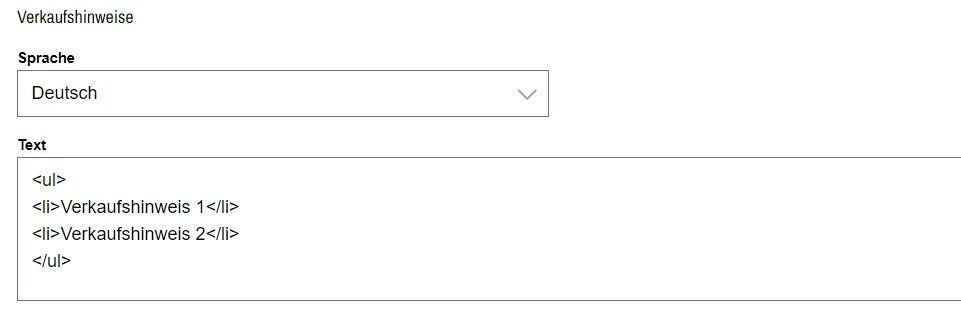 2. Geben Sie die Verkaufshinweise als formatierte HTML-Liste in einem Zusatztext der Textart „Verkaufshinweise“ ein. Diese wird unverändert auf VLB-TIX angezeigt, hier ein Beispiel für die HTML-Liste: