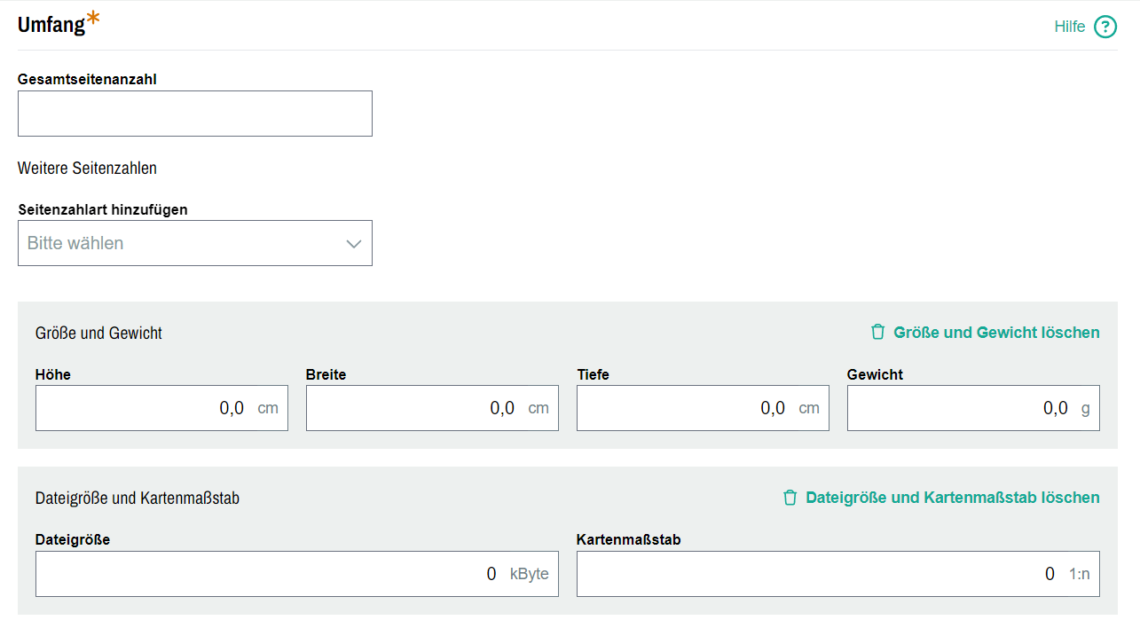 Im Block Umfang werden Daten aufgenommen, die sich auf die materielle bzw. digitale Ausdehnung des Titels beziehen: