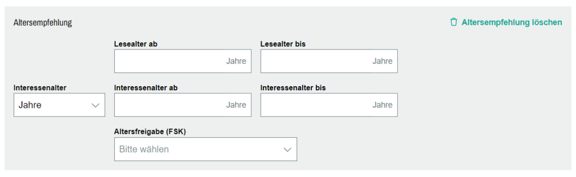 Wollen Sie Angaben zu Altersempfehlungen tätigen, müssen Sie hierzu über den Link “Altersempfehlung hinzufügen” die dafür notwendigen Felder einblenden: