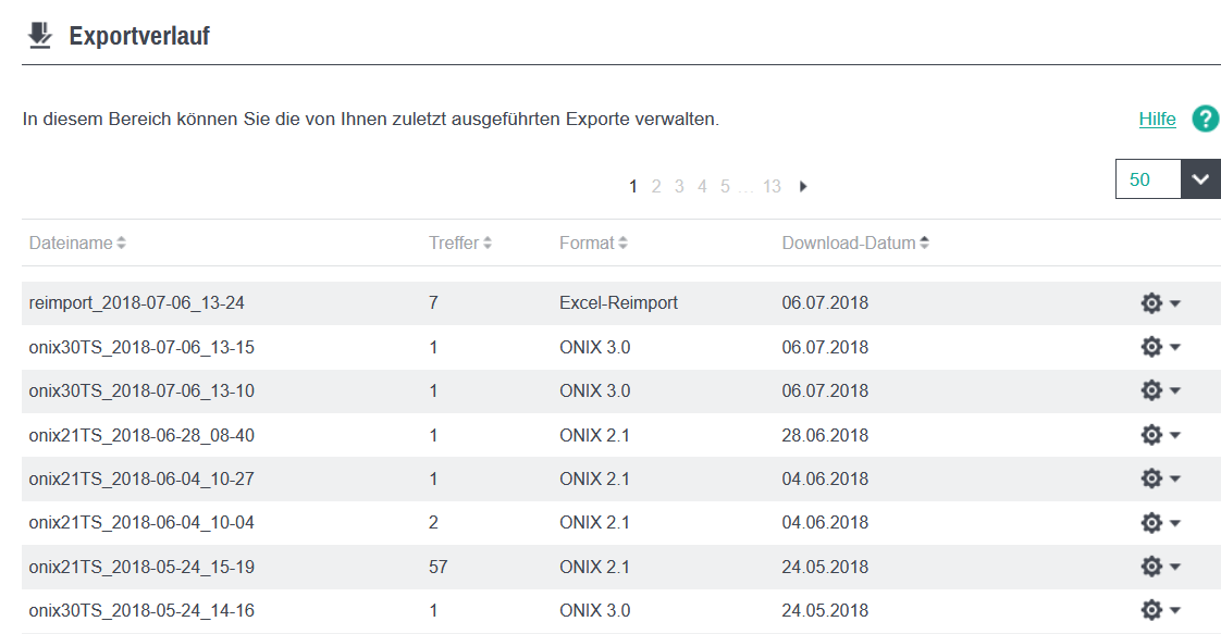 Über das Zahnrad-Symbol können Sie ebenfalls den Export erneut ausführen sowie dessen Namen ändern oder den Export aus dem Exportverlauf entfernen.