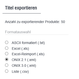 Reihen- und Hierarchieköpfe (In der Trefferliste mit einem “H” oder “R” markiert) können nicht exportiert werden. Titel der Österreichischen Schulbuchdatenbank (ÖSB) sowie Titel des Zeitschriften-Informations-Service (ZIS) können weder in ONIX noch als Excel-Reimport exportiert werden.